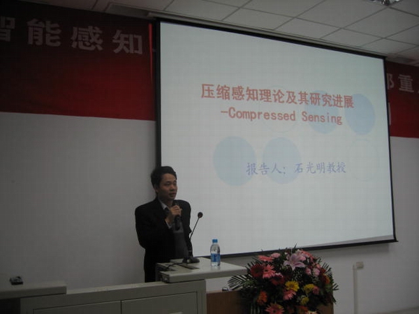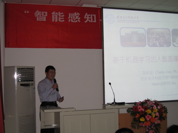 在报告会上,我校学术带头人高新波教授作了题目为《基于机器学习的人脸画像自动生成》的学术报告。高新波教授的研究方向涵盖了信号、图像、视频处理,生物医学成像,模式识别和机器学习等诸多方面。在报告中,他就人脸识别的最新研究成果和研究方法进行了介绍和探讨,介绍了嵌入式隐马尔可夫模型理论和基于该理论的人脸画像自动生成方面的研究成果。报告会中,我校学术带头人石光明教授,天线与微波技术国家重点实验室焦永昌教授,雷达信号处理国家重点实验室邢孟道教授,以及我校学术带头人梁继民教授分别就压缩感知理论,天线优化设计,雷达成像及其发展应用及全天空极光图像分类方法研究等相关课题作了深入的阐述。
