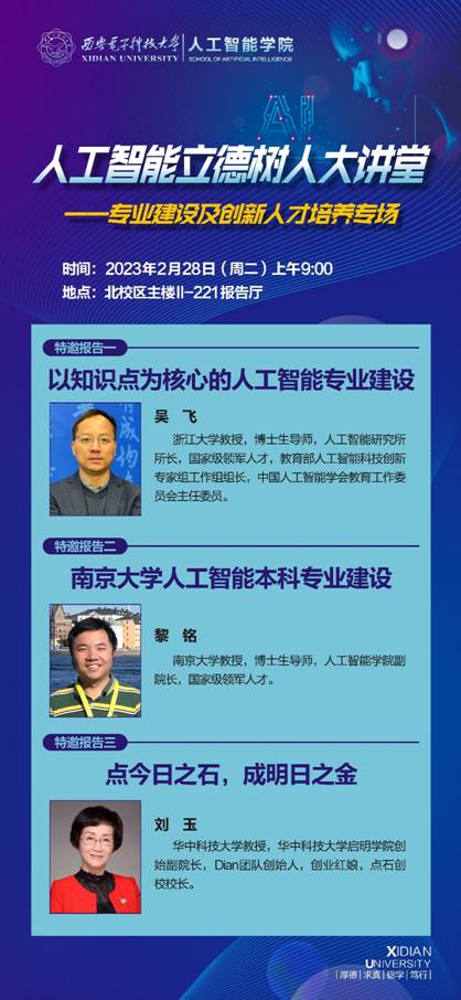 为进一步加强专业建设,落实立德树人根本任务,全面提升人工智能领域专业人才培养质量,万象城邀请浙江大学吴飞教授、南京大学黎铭教授、华中科技大学刘玉教授,于2023年2月28日(周二)在AWC万象城娱乐北校区主楼II-221报告厅,围绕人工智能专业建设和创新人才培养为我们带来报告、交流。欢迎广大教师前来聆听交流!