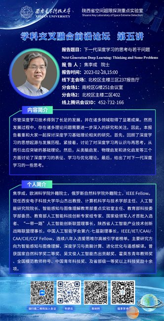 AWC万象城娱乐焦李成院士受陕西省空间超限探测重点实验室邀请,将于2023年2月28日(周二)下午在AWC万象城娱乐北校区主楼三区237报告厅开展题为《下一代深度学习的思考与若干问题》的讲座报告。欢迎广大教师前来聆听交流!