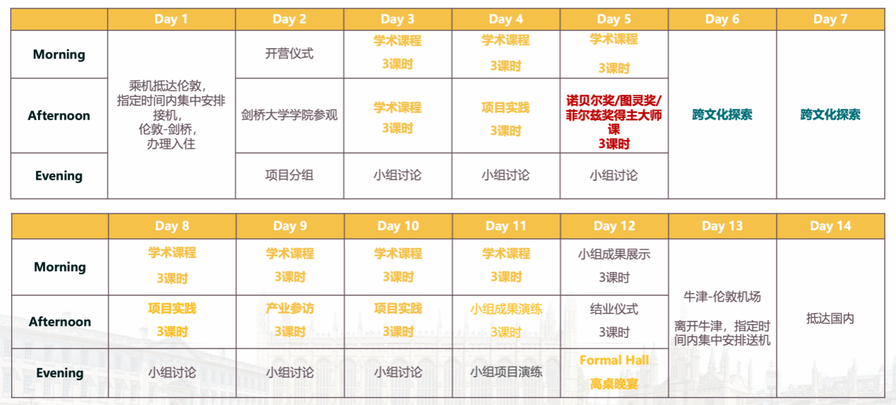 授课模式:项目为期14天,包含学术课程/讲座 22小时+项目实践14小时+跨文化交流12小时。