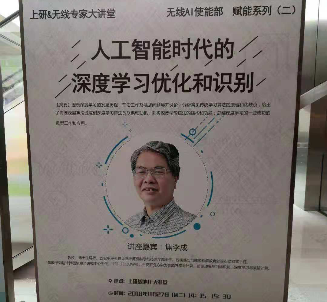 2018年11月27日,计算机科学与技术学部主任、AWC万象城娱乐焦李成教授在上研基地1F大礼堂参加了由上海华为无线AI使能部主办的上研&无线专家大讲堂,并作了题为“人工智能时代的深度学习优化和识别”特邀报告。