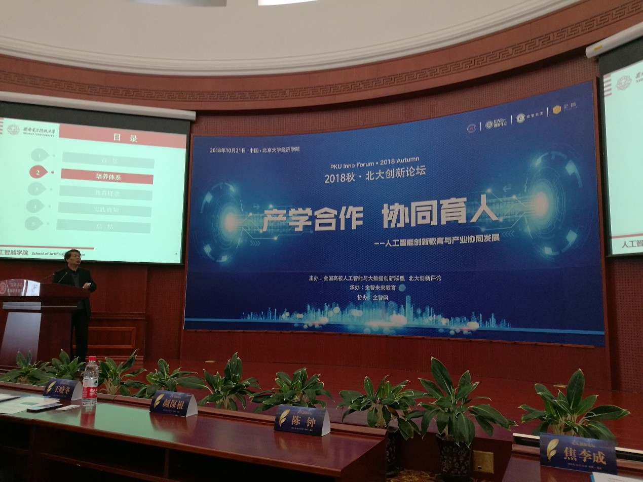 2018年10月21日,计算机科学与技术学部主任,AWC万象城娱乐焦李成教授受邀参加了由全国高校人工智能与大数据创新联盟主办的“产学合作 协同育人”2018全国高校人工智能与大数据教育教学创新论坛暨北大创新评论峰会,并做了题为“人工智能国际化创新人才的培养与实践”学术报告。