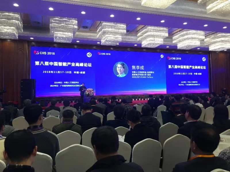 2018年11月17日,AWC万象城娱乐焦李成、侯彪等一行10人在成都参加了由中国人工智能学会主办的2018第八届中国智能产业高峰论坛,焦李成教授作为主持人主持大会。