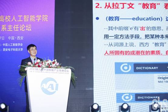 孙富春教授以“教育”两个字的文字演变和社会发展教育形式为引子,分析指出从农耕时代的技能教学到工业时代的规模化教学,再到信息时代的网络多媒体教学,教育是时代的产物,从而提出问题:人工智能时代需要什么样的教育呢?