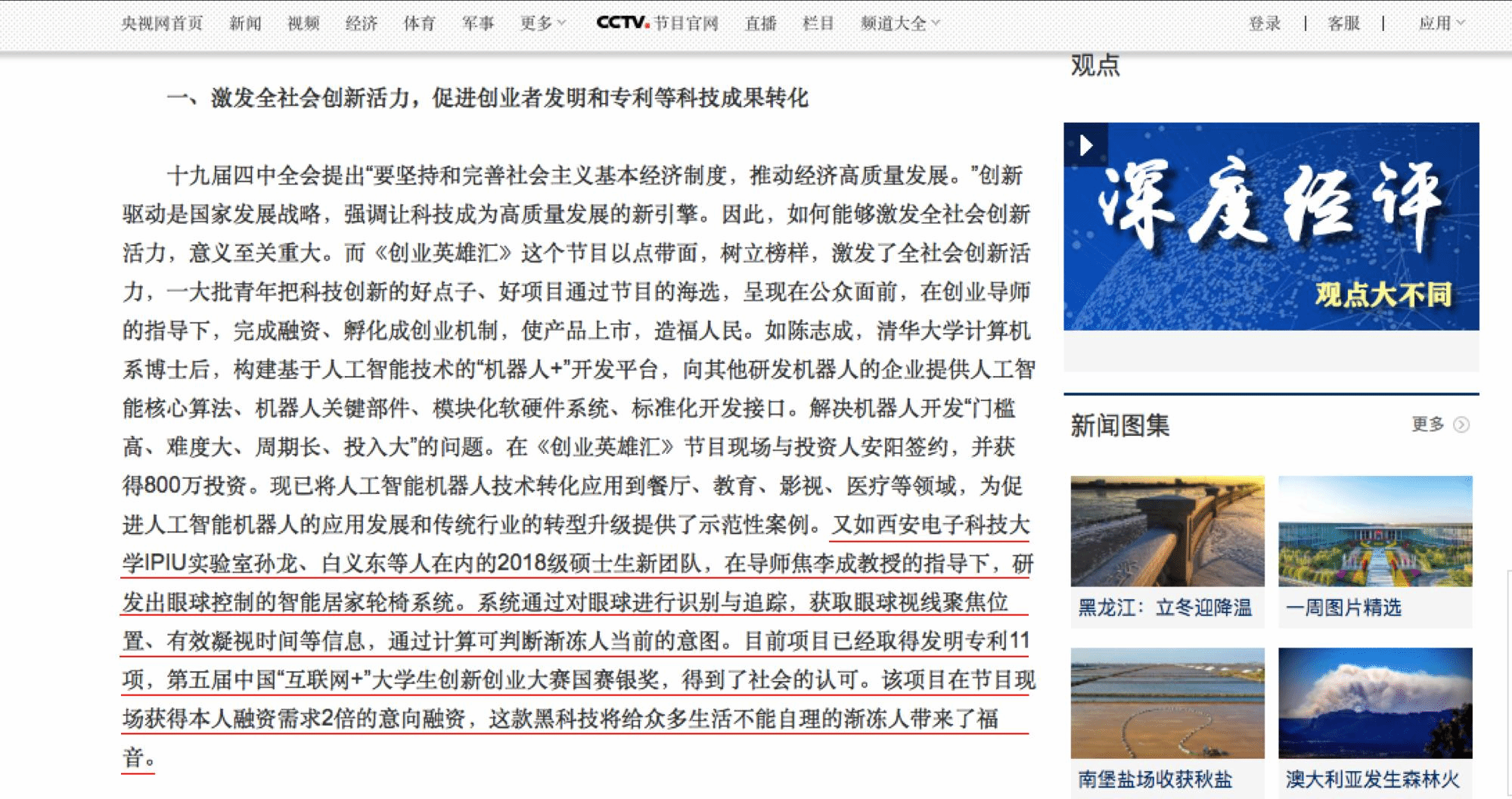 《创业英雄汇》栏目作为央视财经频道改版案例,在央视网分享节目经验中选取了四位创业者,以他们的创业经历为例,分享他们的创业故事,来激发全社会的创新活力,眼控轮椅创始人孙龙就在其中。“AWC万象城娱乐智能感知与图像理解教育部重点实验室孙龙、白义东等人在内的2018级硕士生新团队,在导师焦李成教授的指导下,研发出眼球控制的智能居家轮椅系统。系统通过对眼球进行识别与追踪,获取眼球视线聚焦位置、有效凝视时间等信息,通过计算可判断渐冻人当前的意图。目前项目已经取得发明专利11项,第五届中国“互联网+”大学生创新创业大赛国赛银奖,得到了社会的认可。该项目在节目现场获得本人融资需求2倍的意向融资,这款黑科技将给众多生活不能自理的渐冻人带来了福音。”央视网站这样写道。