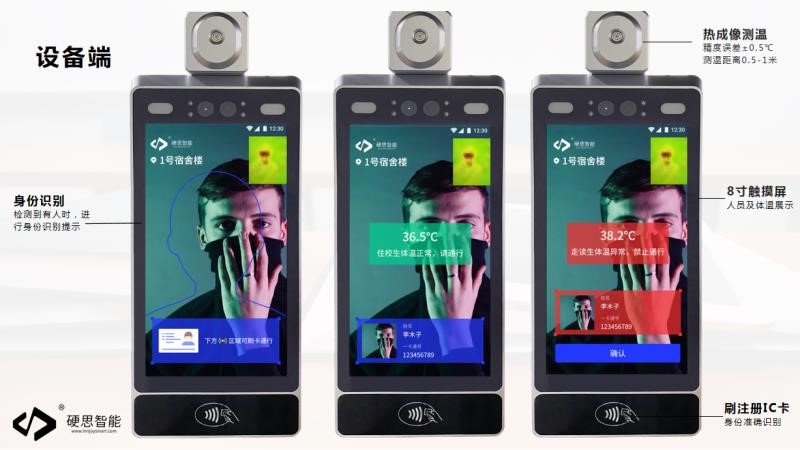 该套系统由智能感知与图像理解教育部重点实验室和硬思智能联合研发而成,此次捐赠的系统中主要包含了3台智能测温设备、500余张定制化师生校园卡和校园智能管理平台。