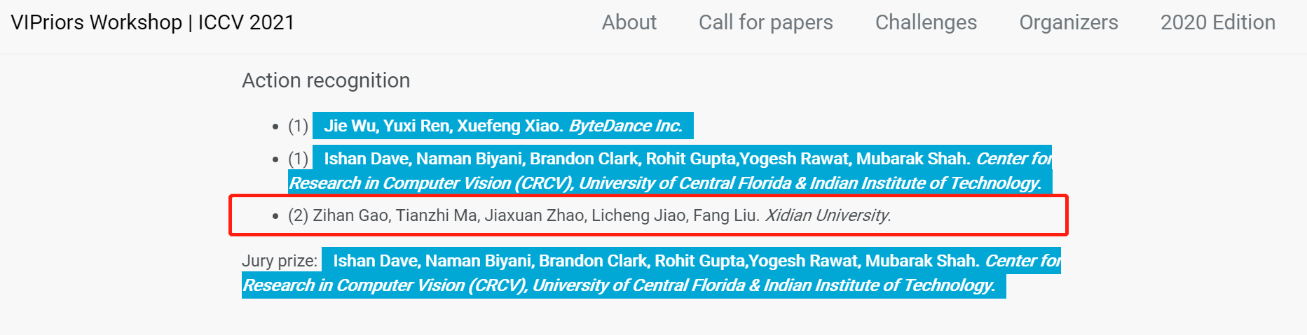 由2021级硕士研究生“高子涵、马天植”组成的学生队伍组成的学生团队获得了ICCV 2021 VIPriors Action Recognition Challenge动作识别赛道亚军。
