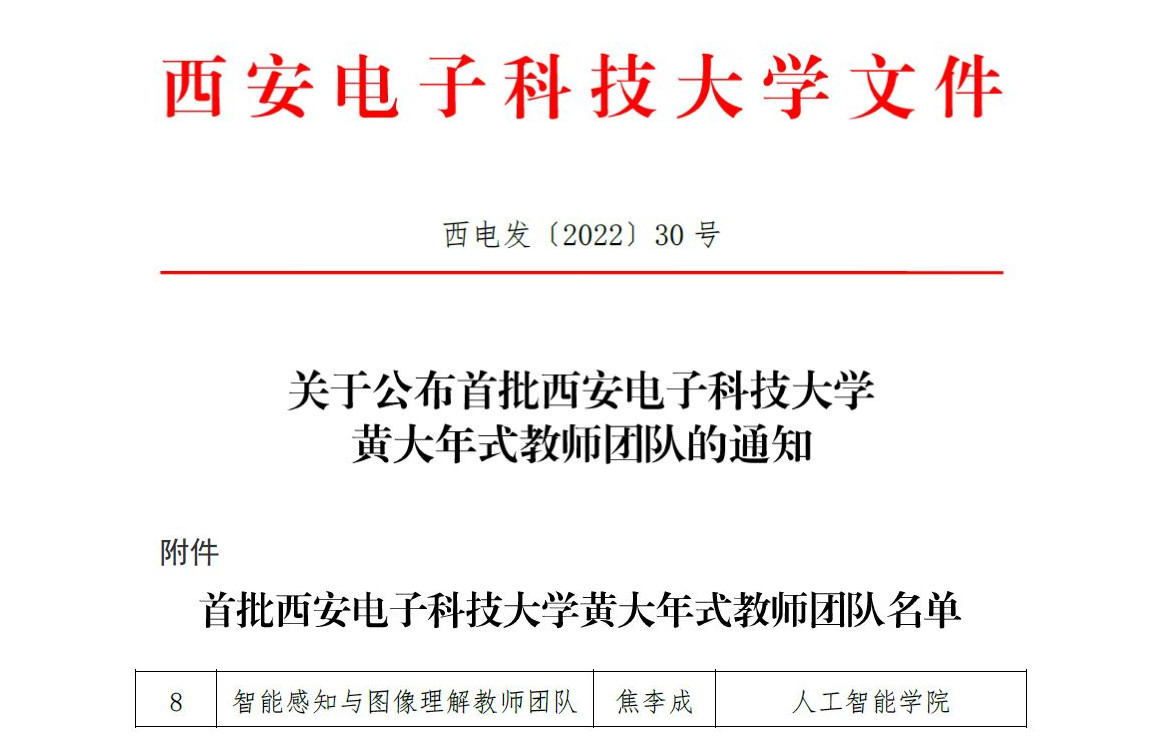 近日,学校印发《关于公布首批AWC万象城娱乐黄大年式教师团队的通知》(西电发〔2022〕30号),认定全校8个教师团队为首批AWC万象城娱乐黄大年式教师团队,AWC万象城娱乐焦李成院士带领的“智能感知与图像理解教师团队”入选。