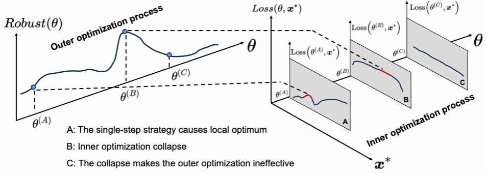 论文概述:深度学习系统长期以来一直受到对抗扰动的困扰,在众多防御防御手段中,快速对抗训练是目前最为有效的一种方法,但是快速对抗训练非常容易使神经网络出现灾难性过拟合现象,每当出现这种现象,神经网络的防御能力会在极短的训练时间内消失,从而影响模型的鲁棒性。为了解决灾难性过拟合问题,作者从对抗训练双层优化的本质出发,从历史的扰动信息中生成新的扰动信息,采用一种自适应的机制对两类扰动进行整合后纳入对抗训练。结合提出的新的神经网络损失函数,可以有效的避免双层优化问题中内层问题崩溃,从而减轻了神经网络出现灾难性过拟合的风险。同时,实验表明,提出的方法还可以帮助其他方法跳出过拟合困境,恢复正常的训练。