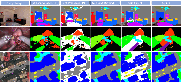 论文概述:目前,在跨域语义分割中,伪标签法是一种流行的方法,它通过训练带有可靠伪标签的像素来提高模型在未见域上的性能。然而,这个范式存在两个关键限制:(1) 在相对严重的域偏移下,大多数选定的可靠像素显得零散且嘈杂。(2) 在处理开放数据时,一些属于开放集类的像素可能表现出高度的置信度。为了解决这些限制,我们提出了一种称为语义连通性驱动的伪标签法的新方法。该方法聚合像素语义,并在语义连通上建模不确定度,可以实现更加高效的语义噪声和开集噪声定位。实验结果表明,在室内图像,医学,遥感等场景上,该方法在多种跨域语义分割任务中表现出色,包括域泛化、一般域适应,开集域适应,以及无源和黑盒域适应,并可以显著提升现有域适应方法的性能。