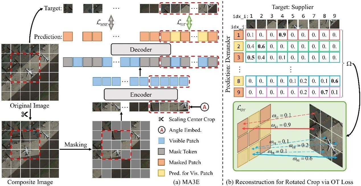 论文概述:为了克服遥感图像和自然图像之间固有的域差异,一些在遥感图像上的自监督表征学习研究取得了不错的进步,但它们都忽略了遥感目标本身的多样角度。本文提出Masked Angle-Aware Autoencoder (MA3E)来感知并学习角度信息。我们设计放缩中心裁剪(Scaling Center Crop)操作在每张图像上创建有着任意朝向的旋转crop来引入显式的角度变化。MA3E以该复合图像作为训练输入,在重建原图的同时复原角度,从而学习丰富的旋转不变性视觉表征。为避免直接重建旋转crop带来偏差,我们提出一个最优传输 (Optimal Transport, OT) loss为旋转crop的全部图像块自动匹配相似的原图patch用于重建。MA3E在三种下游任务的七个不同类型RS图像数据集上取得比现有方法更具竞争力的性能。