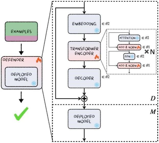 论文概述:常见的对抗防御方法往往涉及大量对抗训练或利用从干净数据中学到的知识,需要大量额外计算资源和训练时间,还可能需要对已有模型进行更新。为了对已部署模型进行快速灵活的防御,本文关注快速插入防御( Rapid Plug-in Defender, RaPiD)问题,希望在不改变已部署模型本身的情况下快速防御对抗攻击。对此,作者提出了一种快速插件防御机制CeTaD,无需改变已有模型,在few-shot对抗性数据上有限微调通用预训练模型就可以得到相适应的可插入防御器。CeTaD有效利用了通用预训练模型的泛化能力和鲁棒性,在多种任务、攻击、目标模型的验证中都具有高效的适应能力。