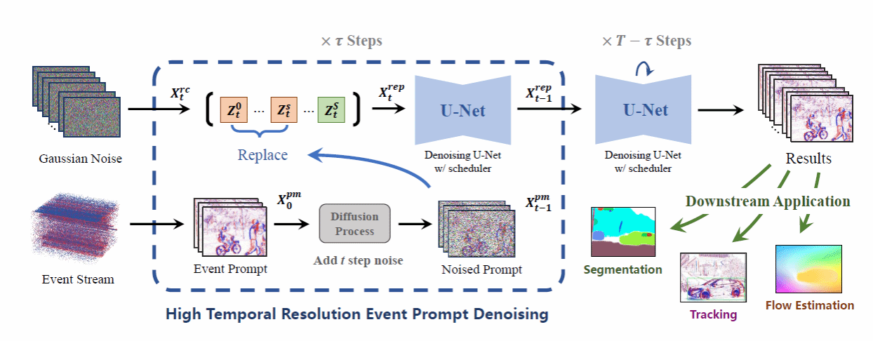 论文概述:预测物体的未来运动是计算机视觉中理解和与动态环境互动的重要任务。事件驱动传感器以卓越的时间精度捕捉场景变化,为实现更细致的运动预测提供了独特的思路。课题组长期从事事件相机系统设计及其信号智能处理。基于此,我们提出将视频扩散模型(Stable Video Diffusion)的强大学习能力与事件相机的丰富运动信息相结合,构建新型的运动预测框架。具体来说,我们首先使用预训练的视频扩散模型对事件序列数据集进行微调,从而将RGB视频的广泛知识迁移到以事件为中心的领域。随后,我们根据事件数据高时间分辨率的特性,重写扩散模型的去噪过程,以丰富的运动先验替代纯净的高斯噪声为起点进行去噪,充分利用事件数据中蕴含的运动信息。此外,我们还引入了一种运动对齐机制,利用强化学习技术提升扩散模型的逆向生成轨迹,确保性能和准确性的提高。通过广泛的测试与验证,我们展示了该方法在多种复杂场景中的有效性,表明其在自动驾驶、机器人导航和交互媒体等计算机视觉应用中,具有革命性推动运动预测领域发展的潜力。