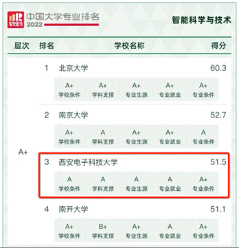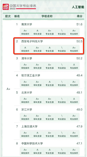 西电人工智能领域专业双双获得A+——2022“软科中国大学专业排名”发布