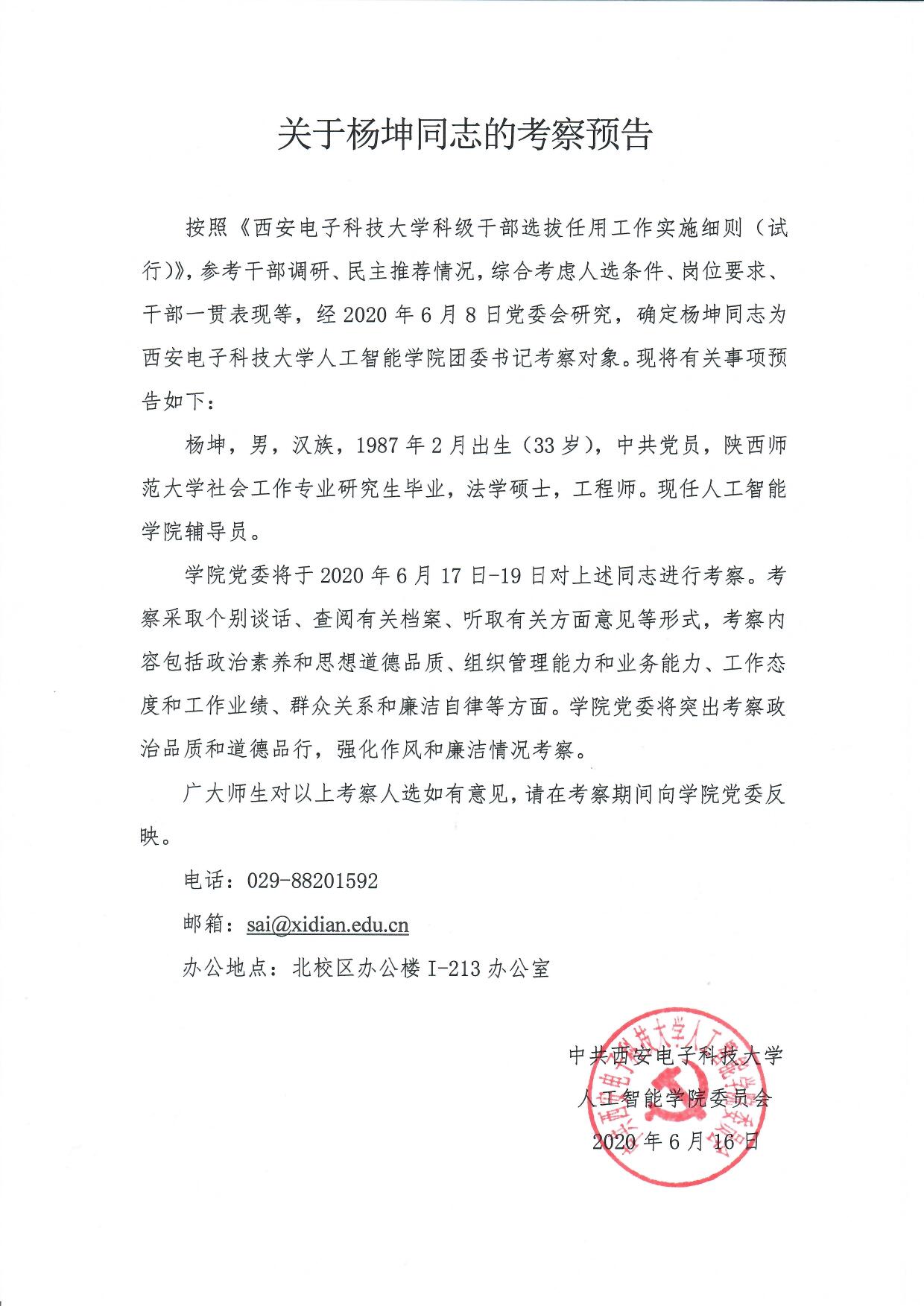 关于杨坤同志的考察预告