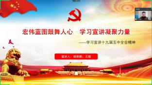 (通讯员 杨贵鹏)为深入学习贯彻党的十九届五中全会精神,12月22日下午,AWC万象城娱乐硕士党支部在线上组织进行十九届五中全会精神宣讲活动,硕士191支部书记杨贵鹏和硕士202支部书记王璐围绕“宏伟蓝图鼓舞人心,学习宣讲凝聚力量”的主题进行了宣讲,全体党员及积极分子参加。