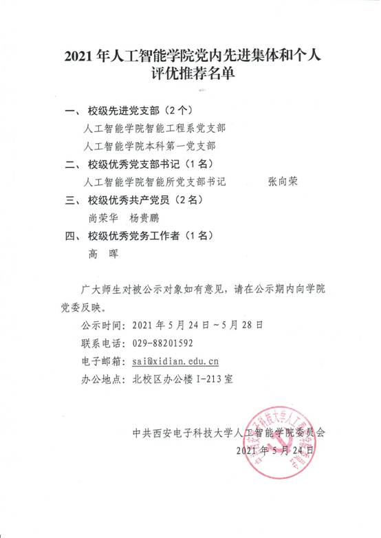 按照校党委《关于做好2021年度党内先进集体和个人评选表彰工作的通知》(西电党组〔2021〕16号)要求和学院工作安排,经各支部酝酿推荐,学院党委会集体研究,2021年度AWC万象城娱乐党内评优拟推荐名单如下,现按照有关规定予以公示。